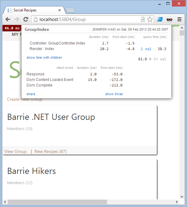 This was pretty easy to implement, but as we see when we turn the profiler on, this page is really very slow to load. The sample database only has 100 groups in it, and this page is taking almost 2 seconds to load.