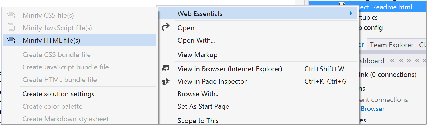 Minification is less common in html files, but the strategy still applies. With the latest version of Web Essentials, you can easily enable minification on your static HTML files. Right click on any HTML file in your project and select Web Essentials –> Minify HTML file(s).